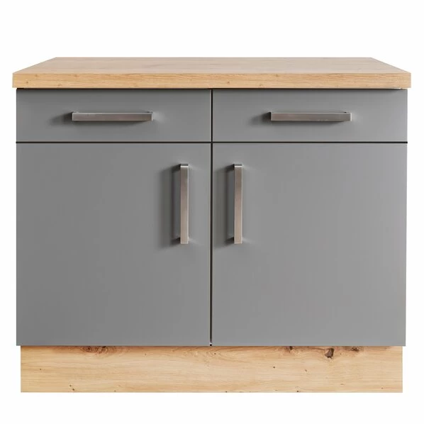 Diese Anrichte mit schicker Front in Schiefergrau und einem Korpus in Artisan Eiche Nachbildung fügt sich bestens in jede Küche. Mit einer Breite von etwa 100 cm und zwei Türen sowie zwei Schubladen bietet sie reichlich Platz zum Verstauen von Geschirr, Besteck oder Utensilien. Zudem lässt sie sich hervorragend mit anderen Schränken aus der Serie kombinieren.