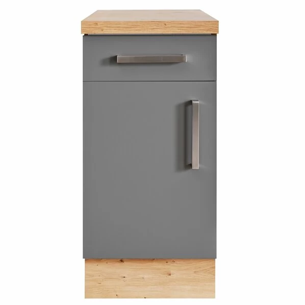 Diese Anrichte mit schicker Front in Schiefergrau und einem Korpus in Artisan Eiche Nachbildung fügt sich bestens in jede Küche. Mit einer Breite von etwa 40 cm und einer Tür sowie einer Schublade bietet sie reichlich Platz zum Verstauen von Geschirr, Besteck oder Utensilien. Zudem lässt sie sich hervorragend mit anderen Schränken aus der Serie kombinieren.