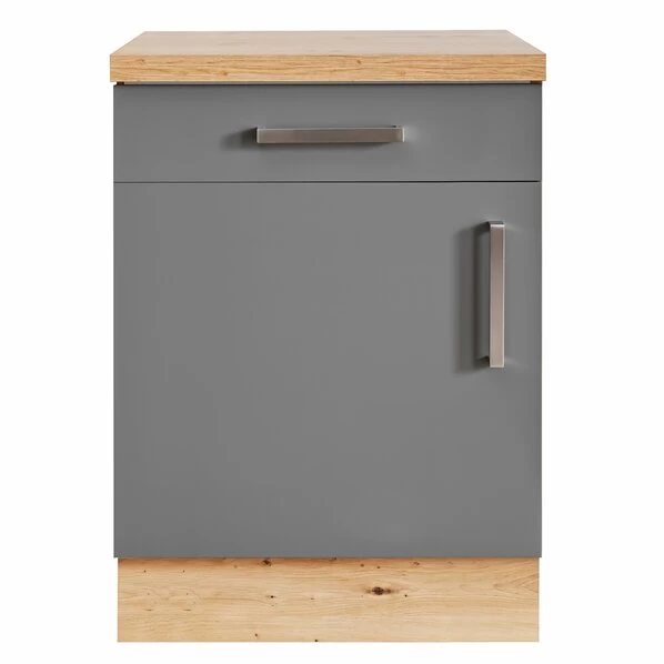 Diese Anrichte mit schicker Front in Schiefergrau und einem Korpus in Artisan Eiche Nachbildung fügt sich bestens in jede Küche. Mit einer Breite von etwa 60 cm und einer Tür sowie einer Schublade bietet sie reichlich Platz zum Verstauen von Geschirr, Besteck oder Utensilien. Zudem lässt sie sich hervorragend mit anderen Schränken aus der Serie kombinieren.