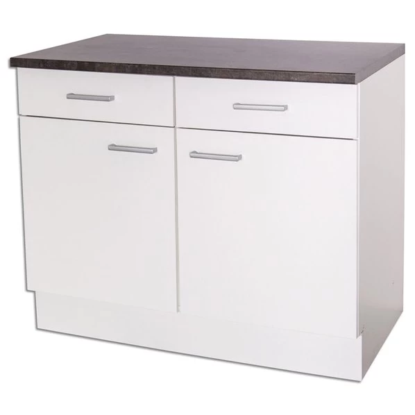 Die breite Anrichte bietet Ihnen eine gute Staumöglichkeit in Ihrer Küche. Durch den durchgehenden Einlegeboden hinter den beiden Drehtüren haben auch große Sachen, wie Salatschüsseln oder Servierplatten Platz finden. Die Arbeitsplatte ist in einer ansprechenden Marmoroptik gehalten, die gut zu den silberfarbenen Griffen passt.