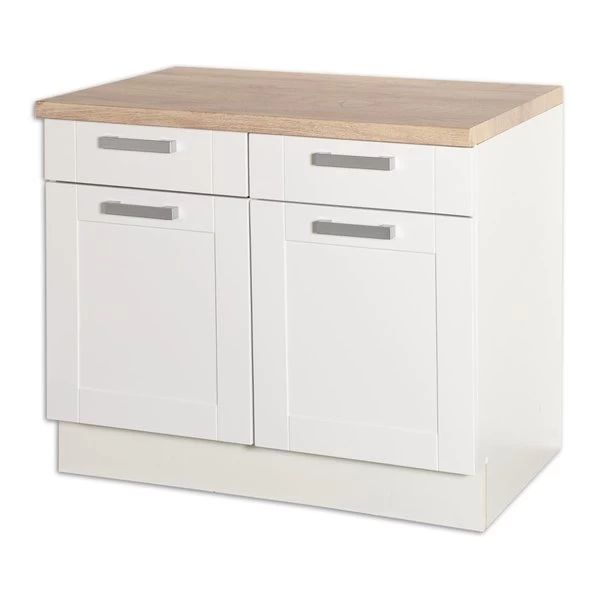 Oben Arbeitsfläche, unten Stauraum – diese Anrichte darf bei Ihrer Küche nicht fehlen. Sie bieten auf ca. 100×60 cm viel Platz zum Schneiden und vorbereiten der Kochutensilien. Darunter bietet sich in zwei Schubkästen Platz für Besteck und Küchenhelfer. Hinter den Türen befindet sich ein durchgehender Einlegeboden, der Raum auf zwei Etagen auch für große Geschirrteile, wie Salatschüsseln oder Serviertabletts, bietet.