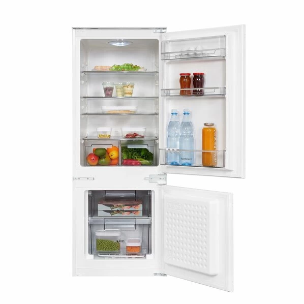 Die Einbau-Kühl-Gefrierkombination EKGC 225-40-110F von EXQUISIT hat einen gesamten Nutzinhalt von etwa 173 Liter. Diese sind aufgeteilt in einem 137 Liter großen Kühlfach und einem ca. 36 Liter großen Gefrierteil. Im Kühlfach befinden sich vier Glasablagen, von denen Sie drei in der Höhe verstellen können. Außerdem sind zwei Schubladen für beispielsweise Obst und Gemüse vorhanden. Eine LED-Innenbeleuchtung im Kühlteil und eine Temperaturregelung sind ebenfalls vorhanden. Das Gefrierteil ist mit zwei Gefrierschubladen ausgestattet.