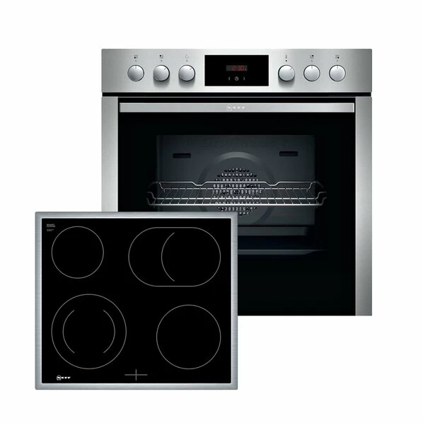 Dieses Einbau-Herdset XE3 von NEFF besteht aus einem Einbauherd und einem Glaskermaik-Kochfeld. Der Einbauherd ist mit fünf Beheizungsarten ausgestattet und verfügt über ein Garraumvolumen von etwa 71 Litern. Über versenkbare Drehwähler und ein LED-Display können Sie das Backgeschehen steuern. Das Glaskeramik-Kochfeld verfügt über vier Kochzonen und einen schicken Edelstahl-Rahmen, der auf der Arbeitsfläche hübsch abschließt.